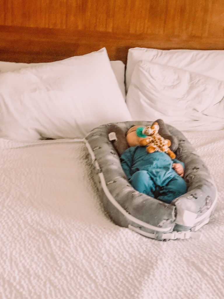 First things first, sleep! Good sleep is hard to come by these days, so I take it very seriously when making sure we have all the things to make our night successful. At home Kane sleeps in a bassinet and of course we can’t bring that with us, so we bring the next best thing… the DockATot! If you don’t don’t already have one of these you NEED one. They are like magic! Most importantly they are perfect for travel. Kane sleeps safely in bed with us, in his cozy little bed. We don’t co-sleep normally, so this has created a learning curve for us. But this is the perfect solution to keeping him safe while we sleep since the hotel only has one bed.