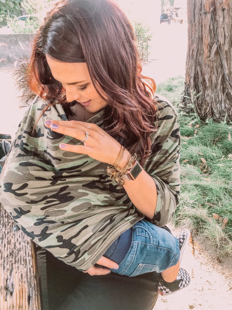 Not only is this cover super cute and stylish but it is multifunctional! I love knowing that it covers every inch of me and that I don’t have to worry about anyone getting an eyeful. It wraps around me like a poncho and the neck is loose enough that I can look in to check on him while he is eating. We also use it to cover the car seat when little man is asleep. Especially, during these unpredictable times of COVID. It’s nice knowing he is safe inside and won’t get sneezed on.