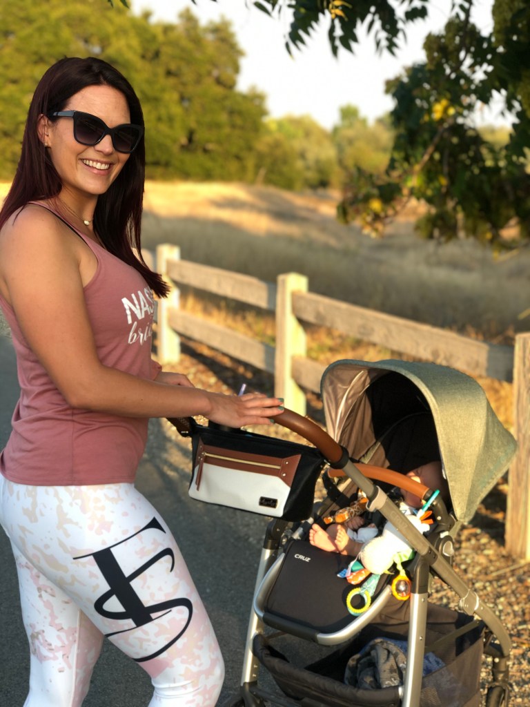 I swore I wouldn’t need one and lasted about a month before getting one, but having a stroller caddy is definitely helpful. Especially, if you plan to take your sweet baby on lots of walks. Let’s face it, as comfortable as leggings are, they rarely have pockets! We need somewhere to put our water bottle and house keys.